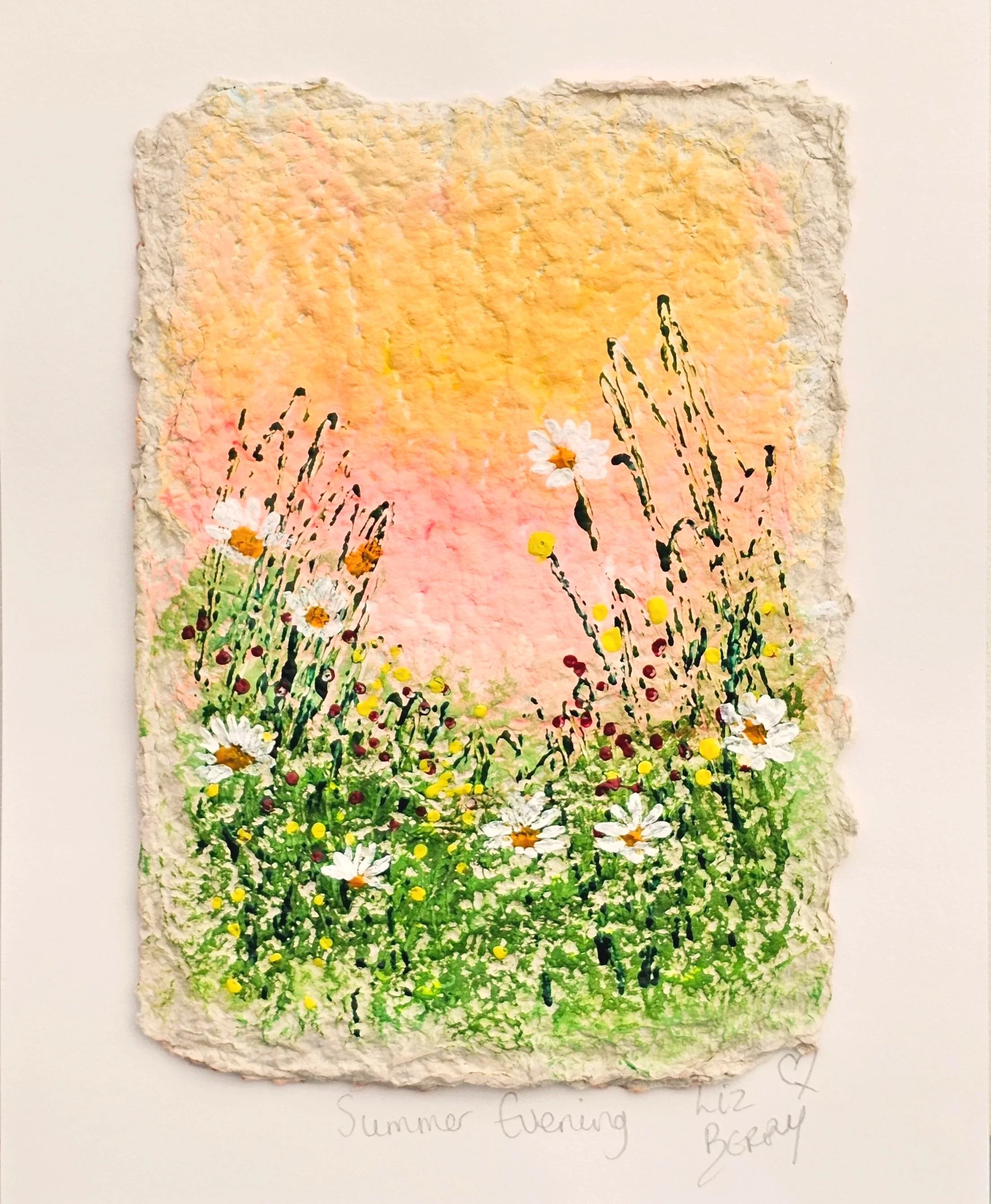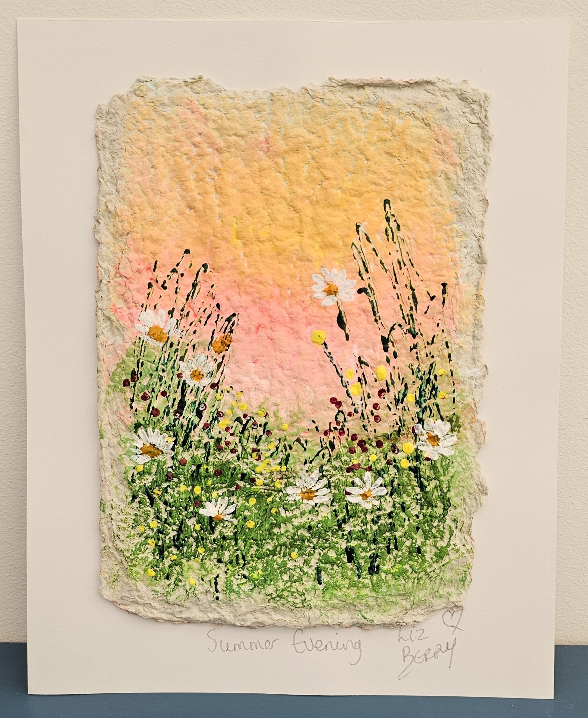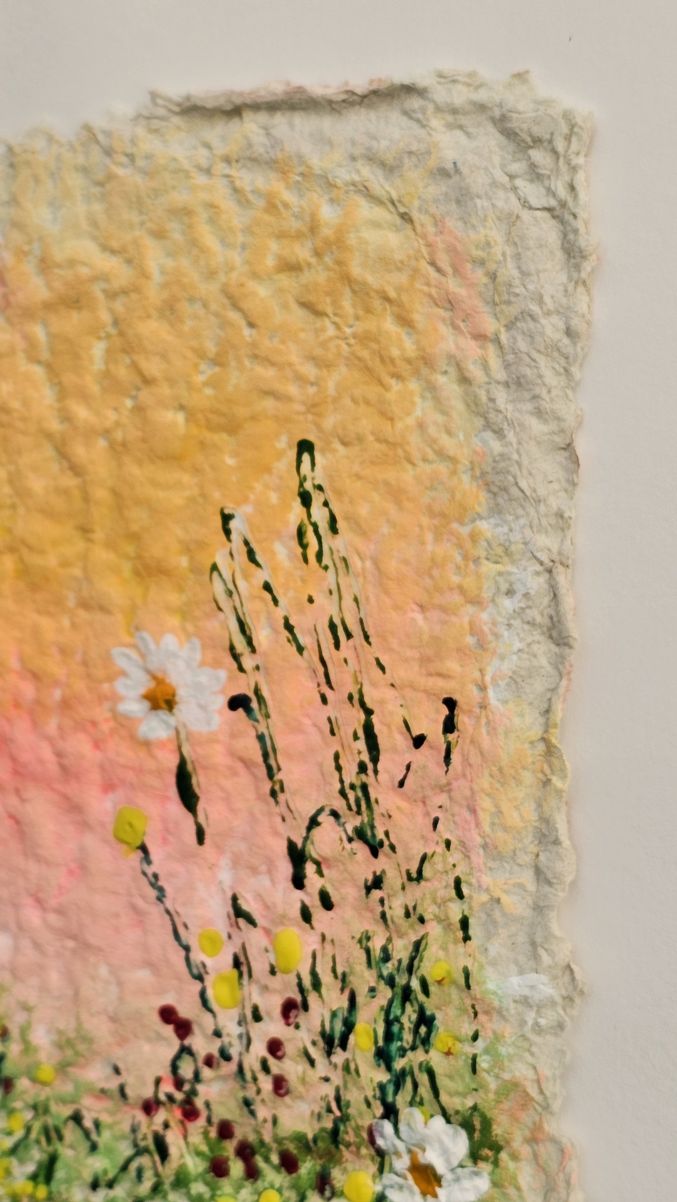 Painted on my own handmade paper, this piece carries layers of past creative life within it. I recycle old paintings, sketches, and paper scraps by pulping them, hand‑pressing each sheet, and letting them dry naturally in the sun. The result is a beautifully textured surface, often flecked with colour from earlier work, creating a unique foundation for every new painting.