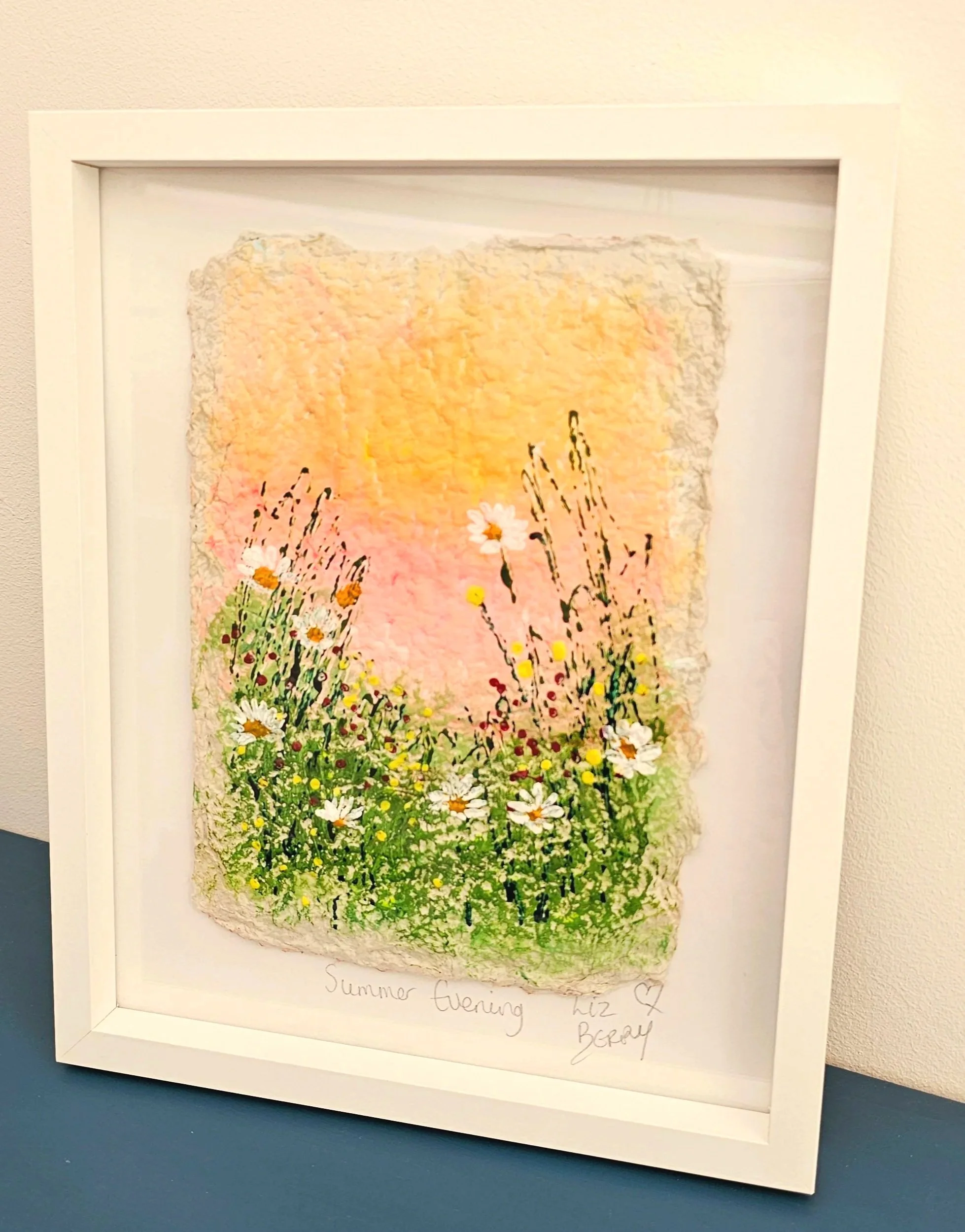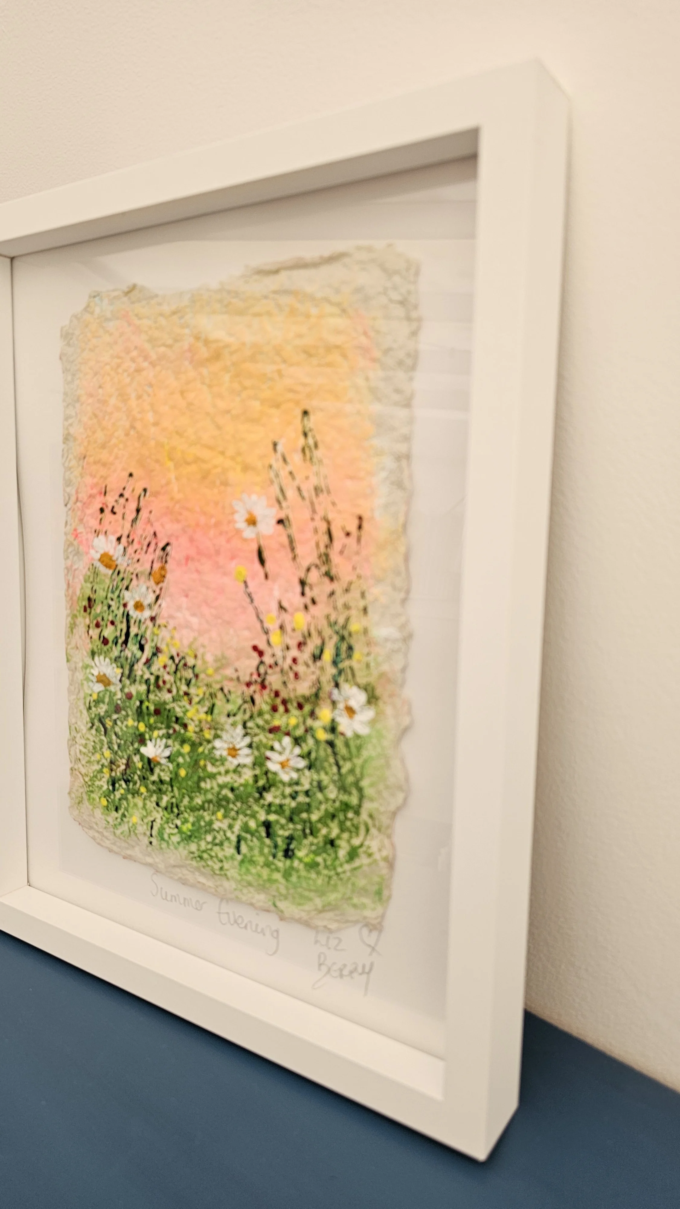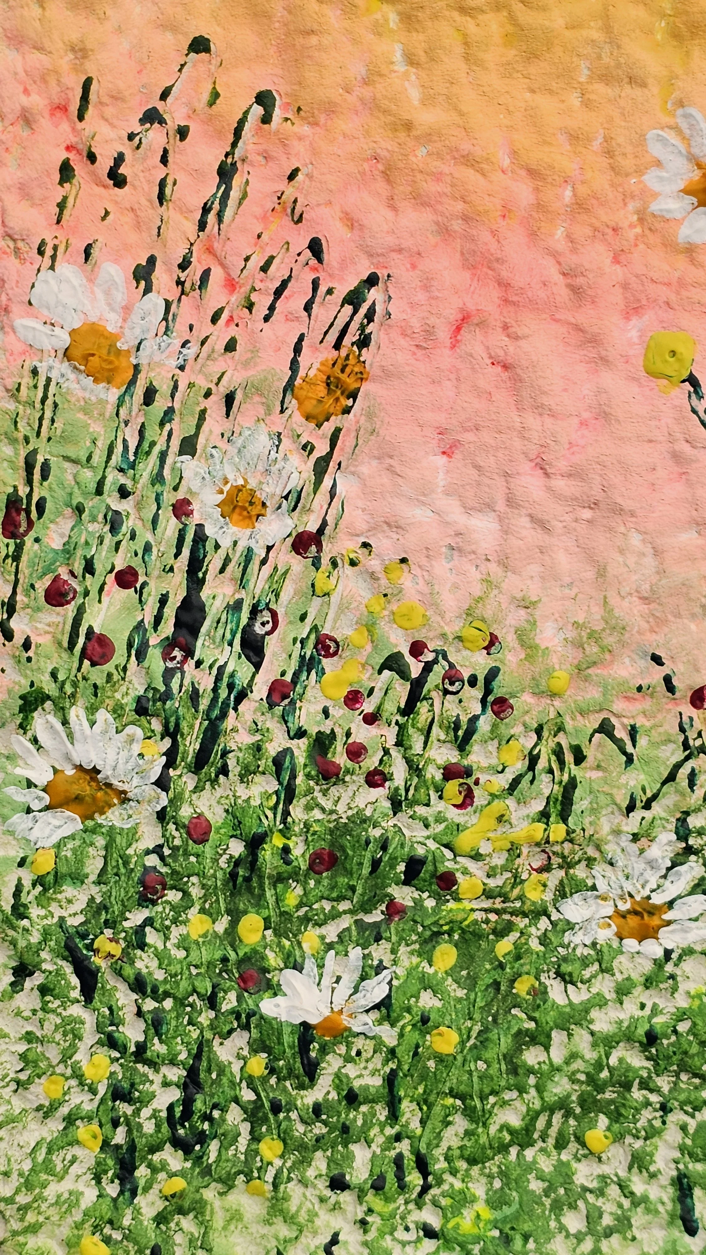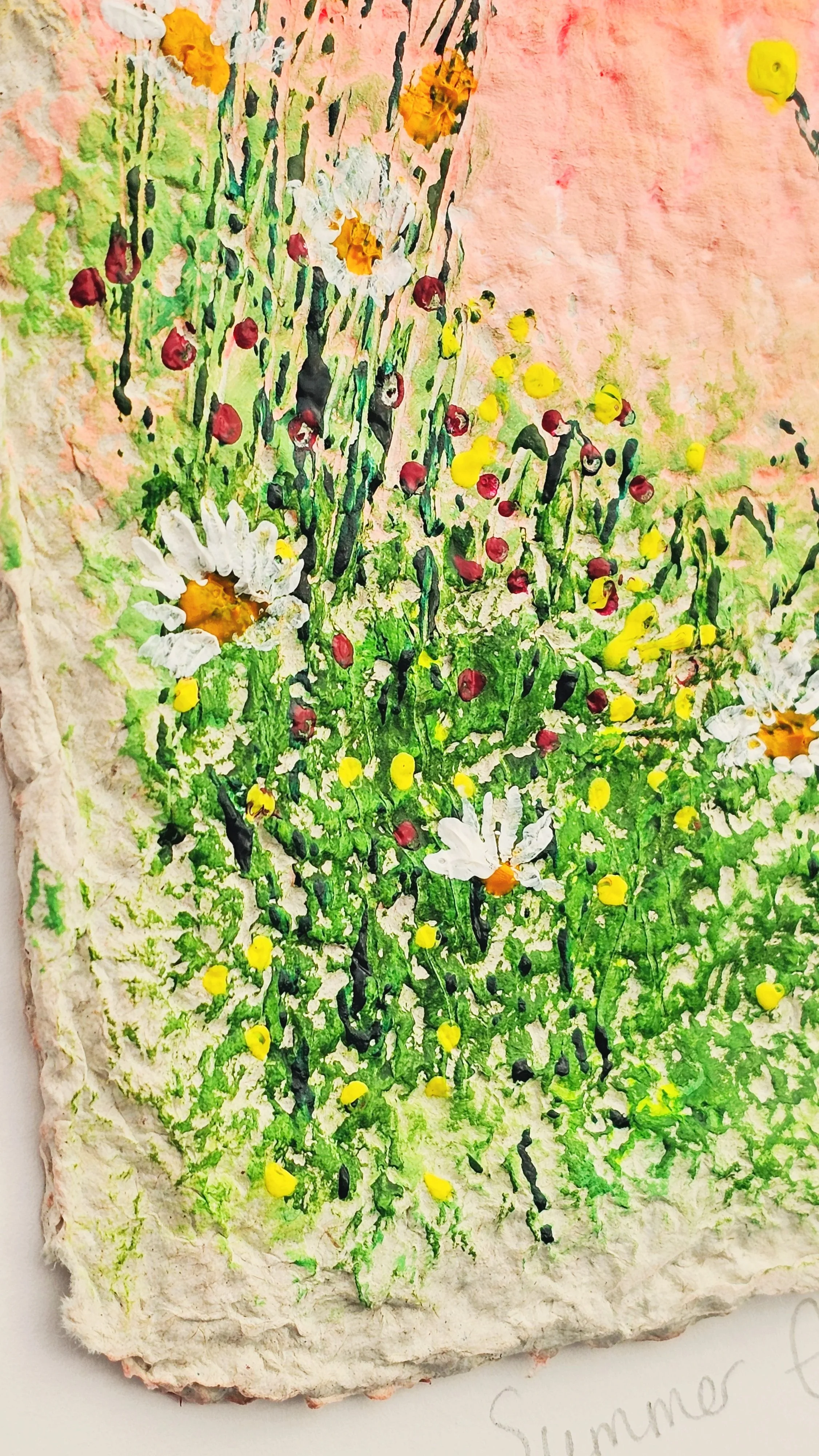 Painted on my own handmade paper, this piece carries layers of past creative life within it. I recycle old paintings, sketches, and paper scraps by pulping them, hand‑pressing each sheet, and letting them dry naturally in the sun. The result is a beautifully textured surface, often flecked with colour from earlier work, creating a unique foundation for every new painting.